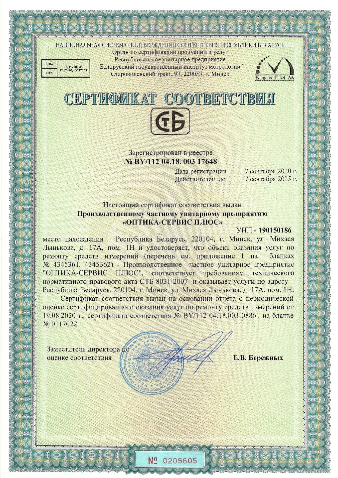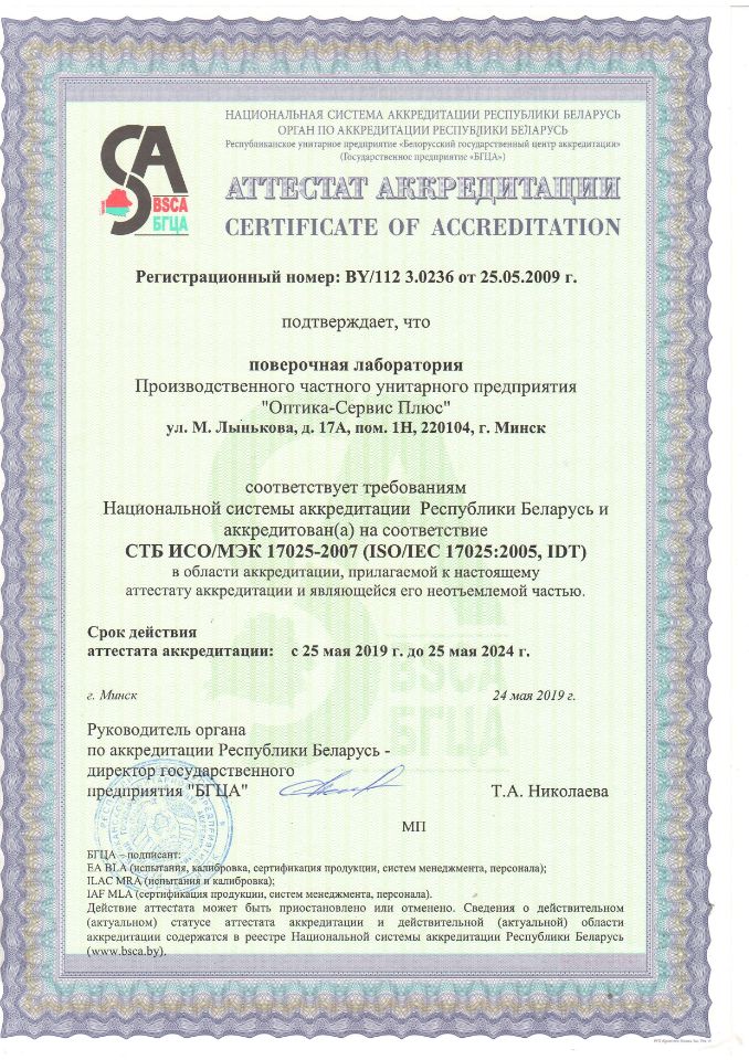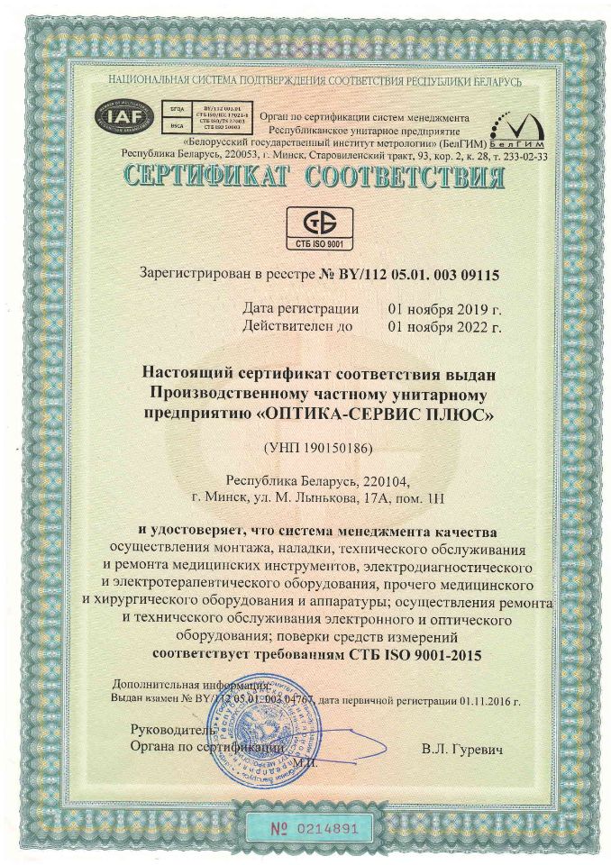 Предприятие "Оптика-Сервис Плюс" более 20 лет оказывает услуги по техническому обслуживанию и ремонту медицинской и лабораторной техники. Специалисты нашей организации имеют большой опыт по самому широкому спектру обслуживаемой техники. На базе предприятия функционирует аккредитованная лаборатория, оказывающая услуги по поверке дозаторов пипеточных. Производственный процесс на предприятии организован в рамках СТБ ISO 9001-2015, ГОСТ ISO 13485-2017, СТБ 8031-2007, СТБ ИСО/МЭК 17025-2007.
